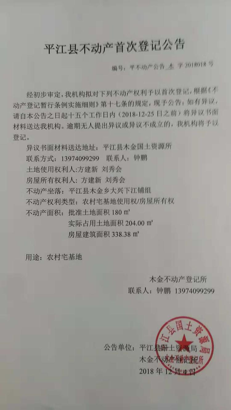方建新 刘秀会不动产首次登记公告 木字2018018号