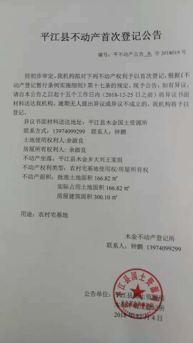 余啟良不动产首次登记公告 木字2018019号
