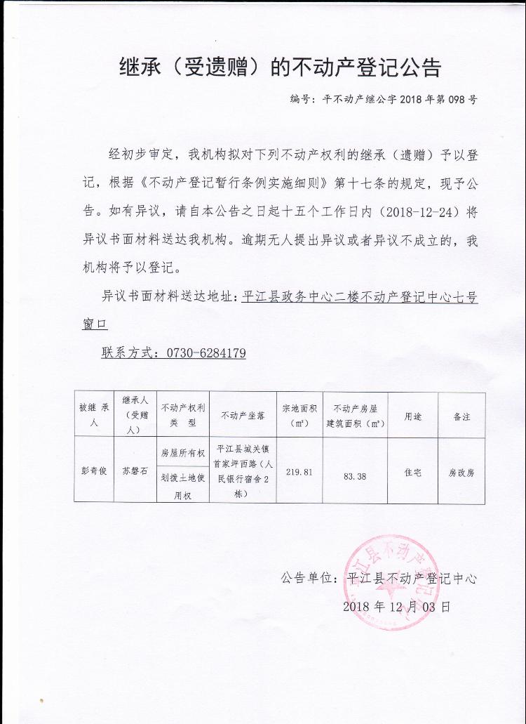 苏磐石继承(受遗赠)的不动产登记公告平不动产继公字2018年第098号