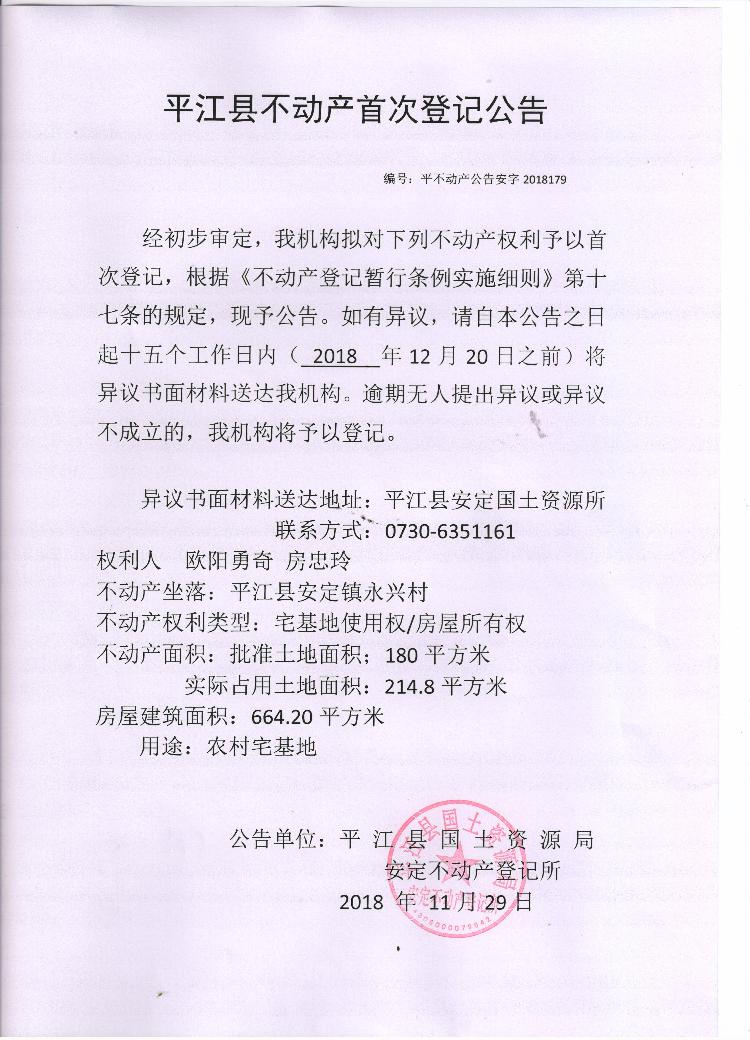 欧阳勇奇 房忠玲不动产首次登记公告 安字2018179