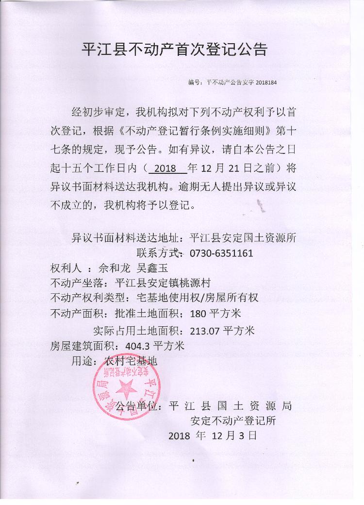 佘和龙 吴鑫玉不动产首次登记公告 安字2018184