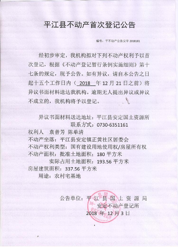 袁普芳 陈单清不动产首次登记公告 安字2018181