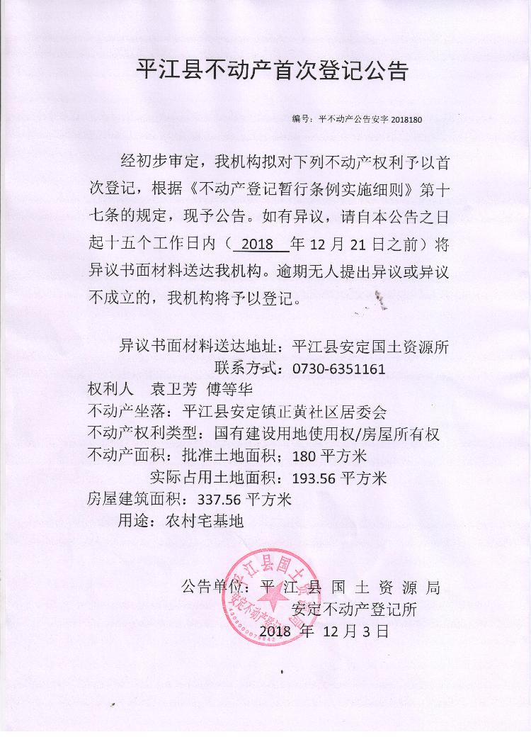 袁卫芳 傅等华不动产首次登记公告 安字2018180