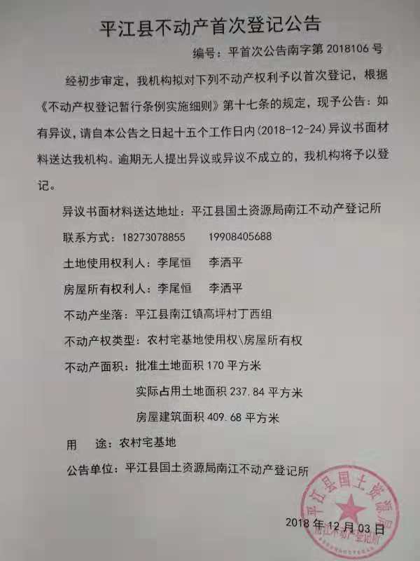 李尾恒 李洒平不动产首次登记公告 南字第2018106号