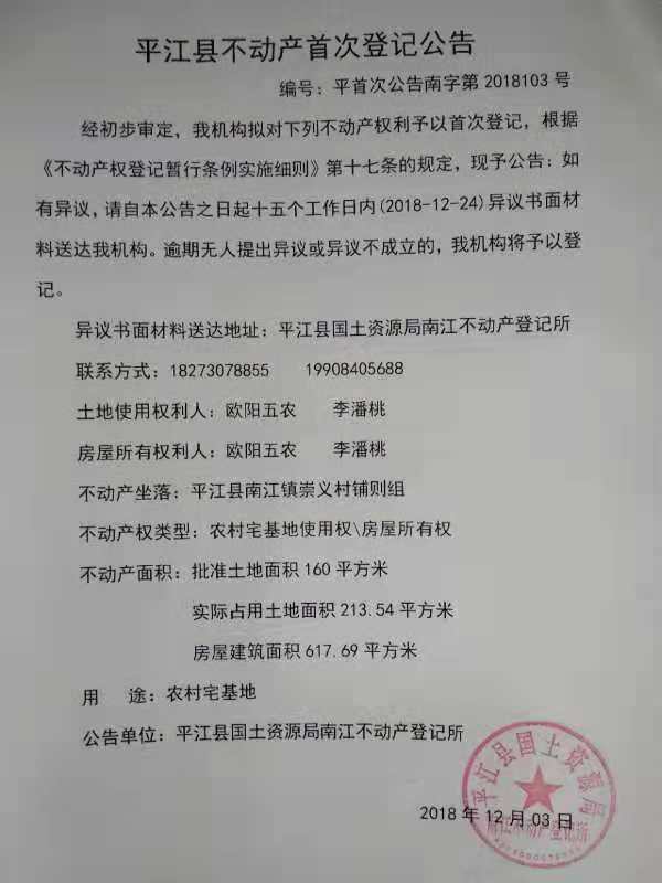 欧阳五农 李潘桃不动产首次登记公告 南字第2018103号