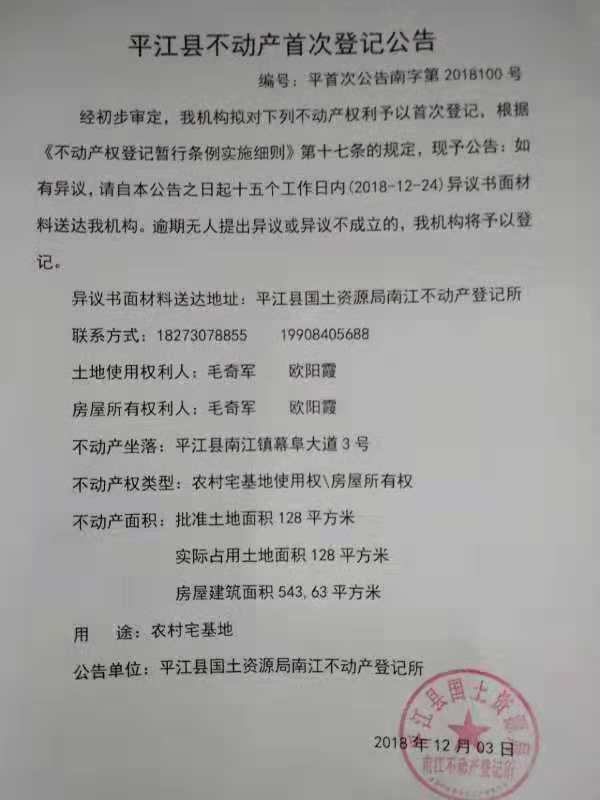 毛奇军 欧阳霞不动产首次登记公告 南字第2018100号
