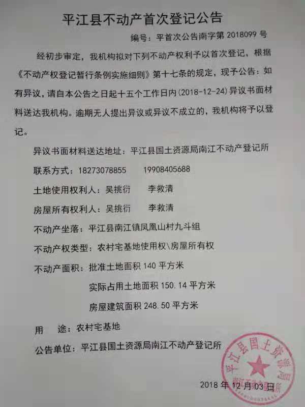 吴桃衍 李救清不动产首次登记公告 南字第2018099号