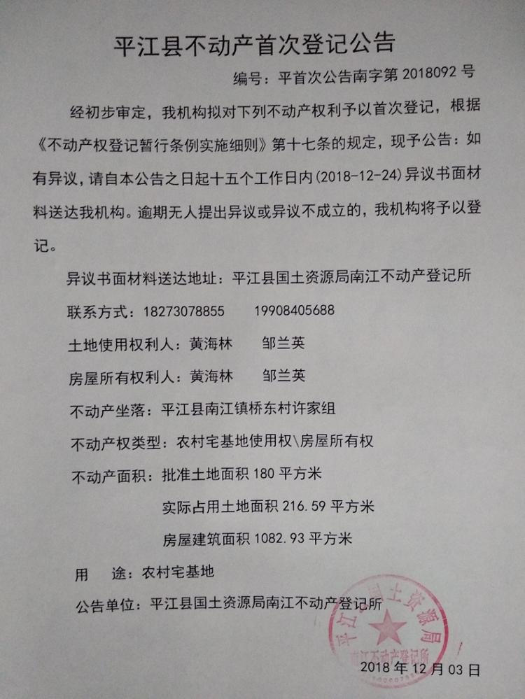 黄海林 邹兰英不动产首次登记公告 南字第2018092号