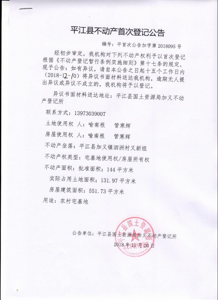 喻南根 管寒辉不动产首次登记公告 加字第2018095号