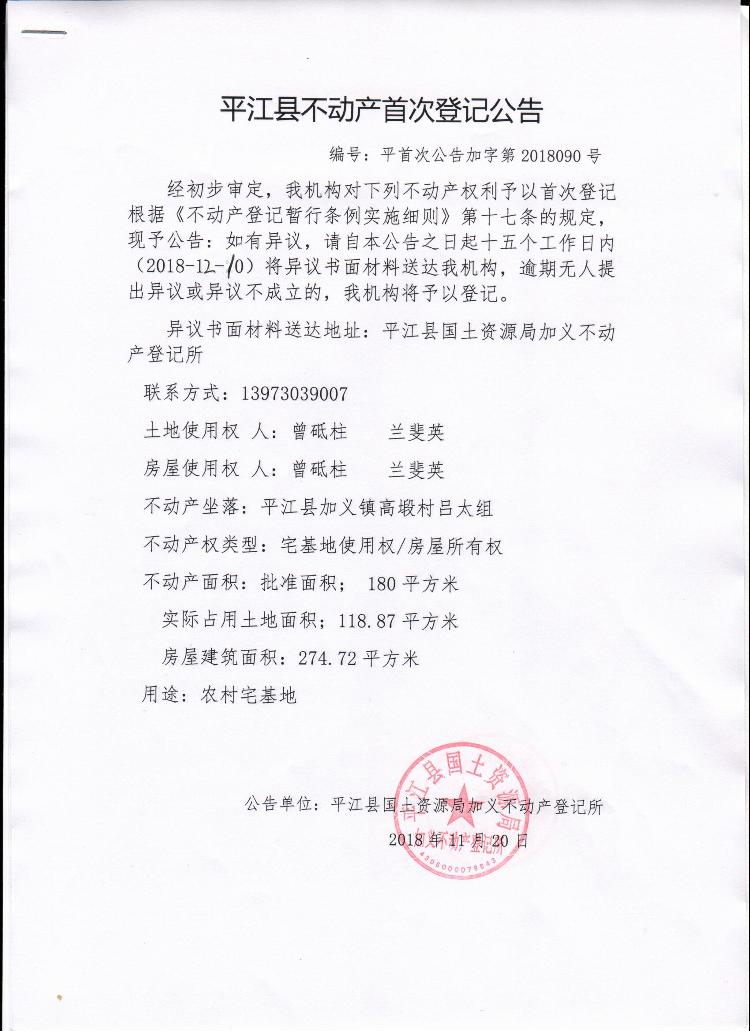 曾砥柱 兰斐英不动产首次登记公告 加字第2018090号