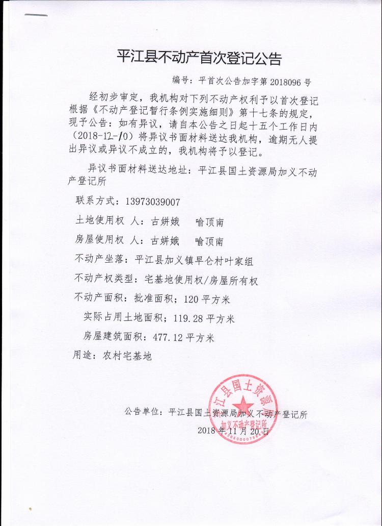 古姘娥 喻顶南不动产首次登记公告 加字第2018096号