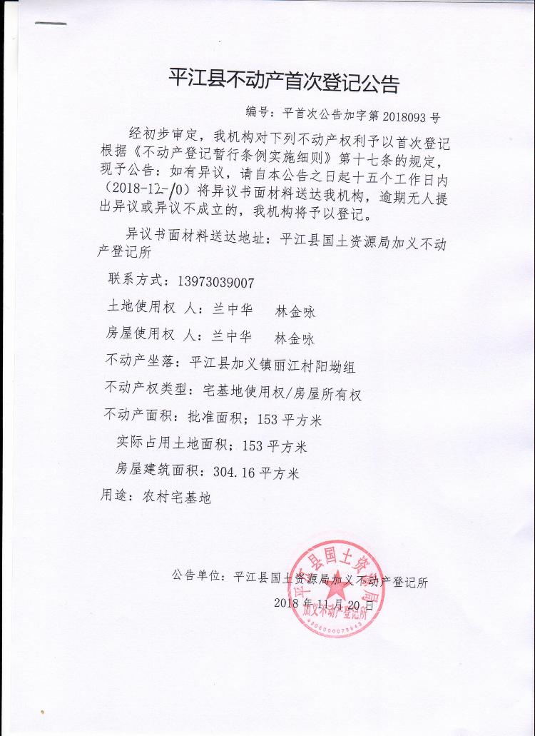 兰中华 林金咏不动产首次登记公告 加字第2018093号