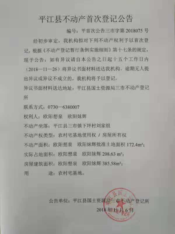 欧阳想泉 欧阳妹辉不动产首次登记公告 三市字第2018075号