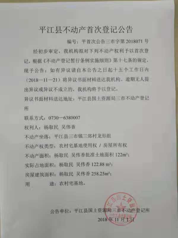 杨取民 吴伟香不动产首次登记公告 三市字第2018071号