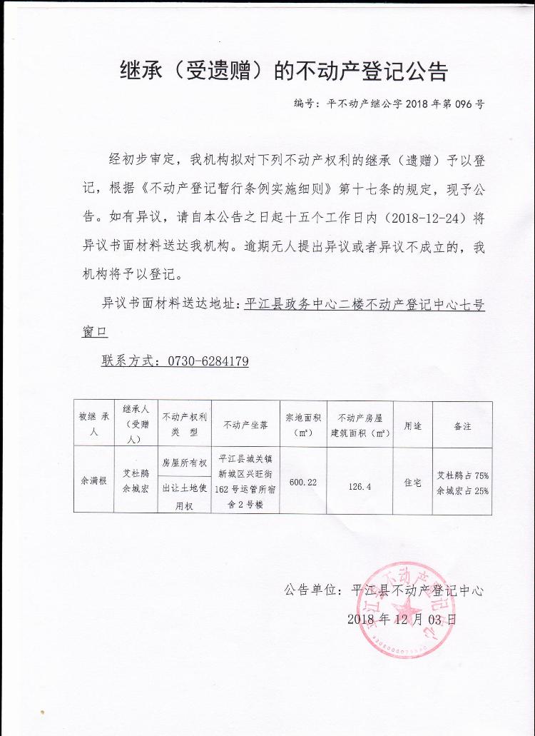 艾杜鹃 余城宏继承(受遗赠)的不动产登记公告平不动产继公字2018年第096号