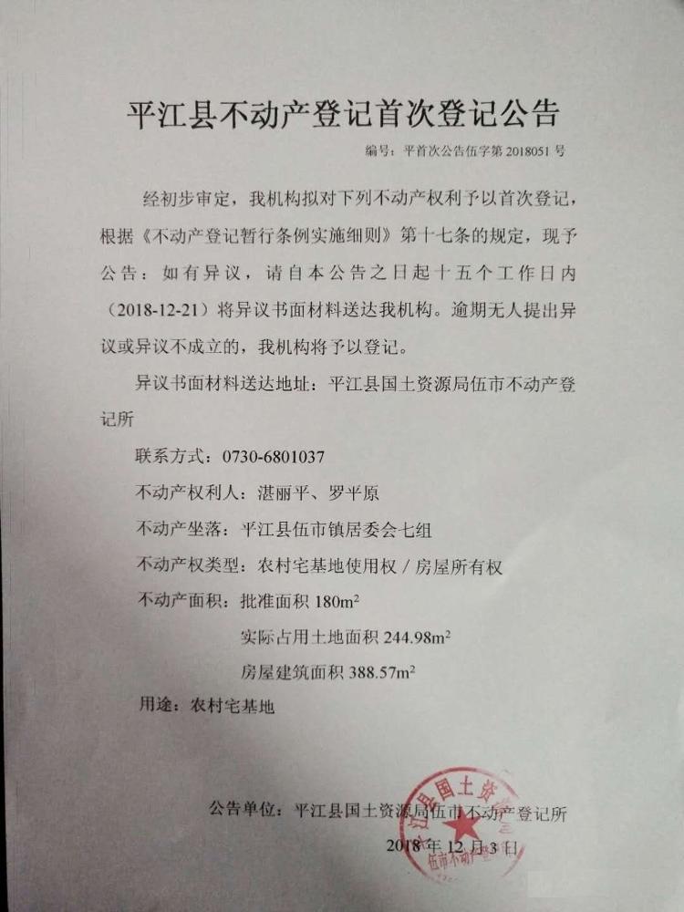 湛丽平 罗平原平江县不动产登记首次登记公告 伍字第2018051号