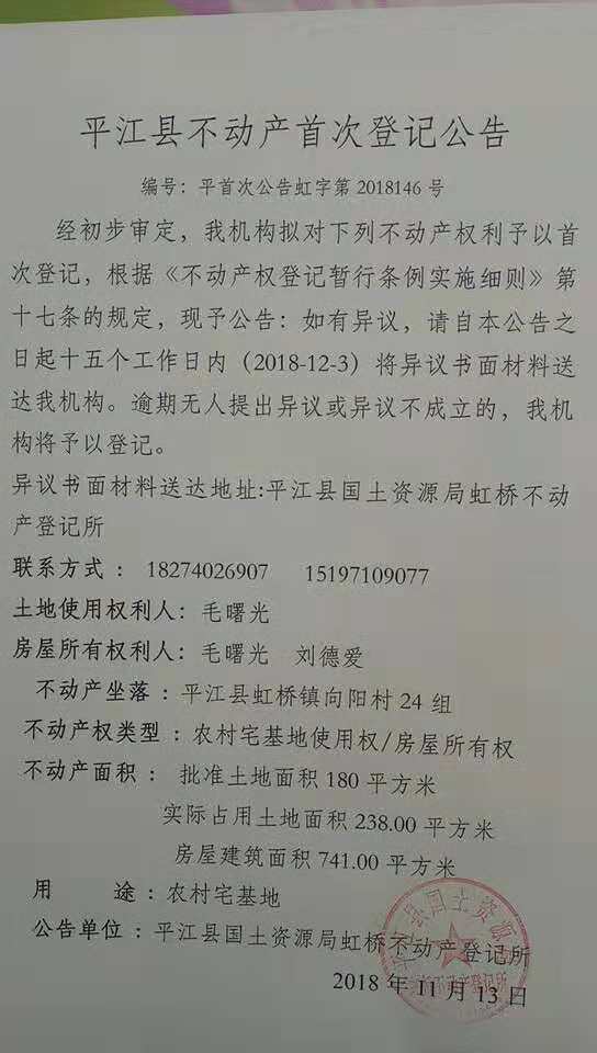 毛曙光 刘德爱不动产首次登记公告 虹字第2018146号