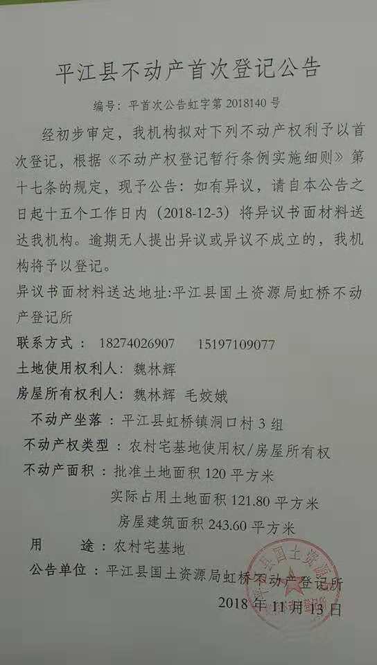 魏林辉 毛姣娥不动产首次登记公告 虹字第2018140号