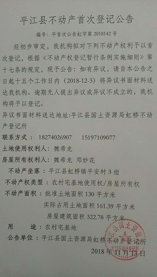 魏希龙 邓妙花不动产首次登记公告 虹字第2018142号