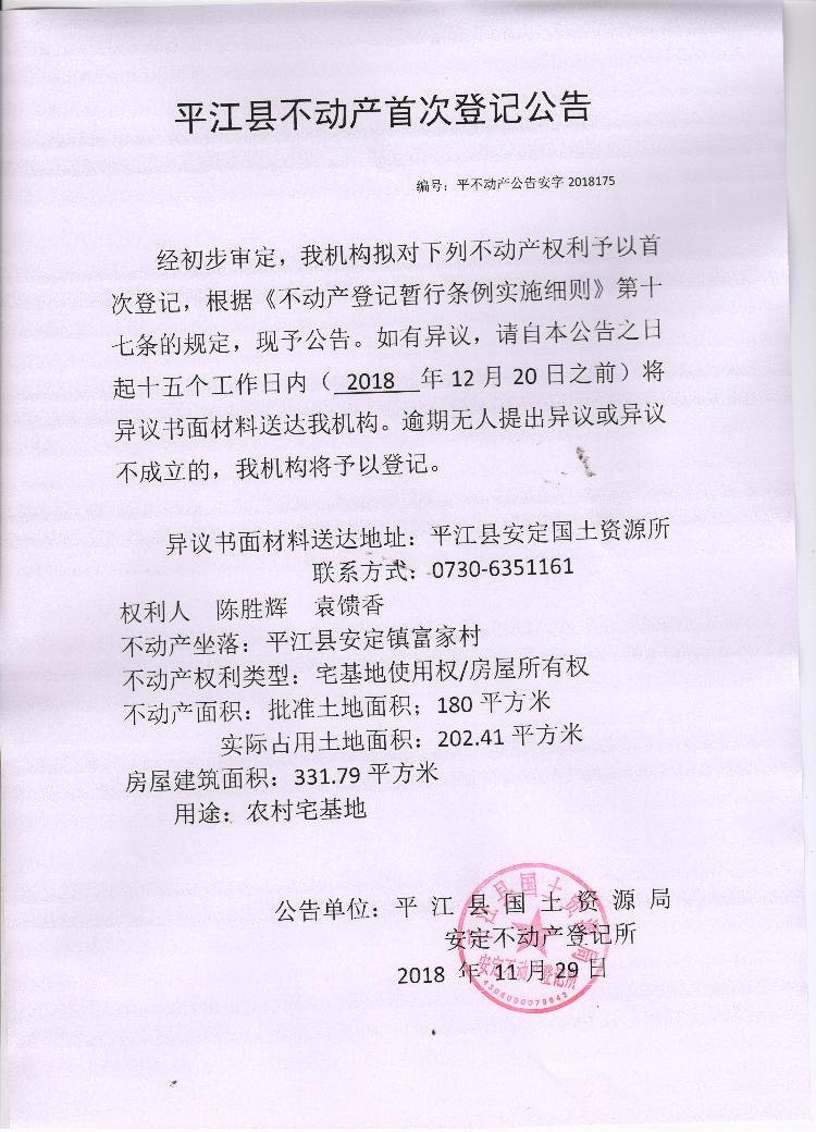 陈胜辉 袁馈香不动产首次登记公告 安字2018175