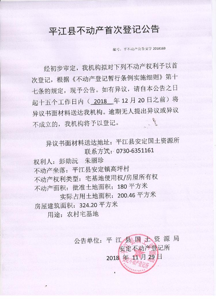 彭勋沅 朱丽珍不动产首次登记公告 安字2018169