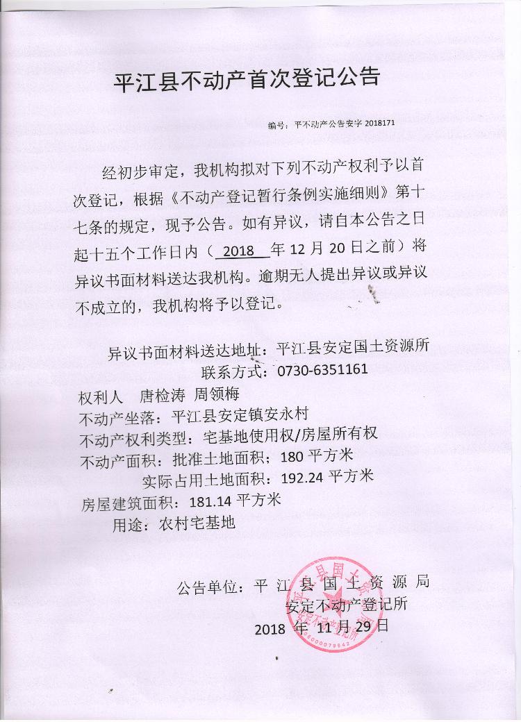 唐捡涛 周领梅不动产首次登记公告 安字2018171