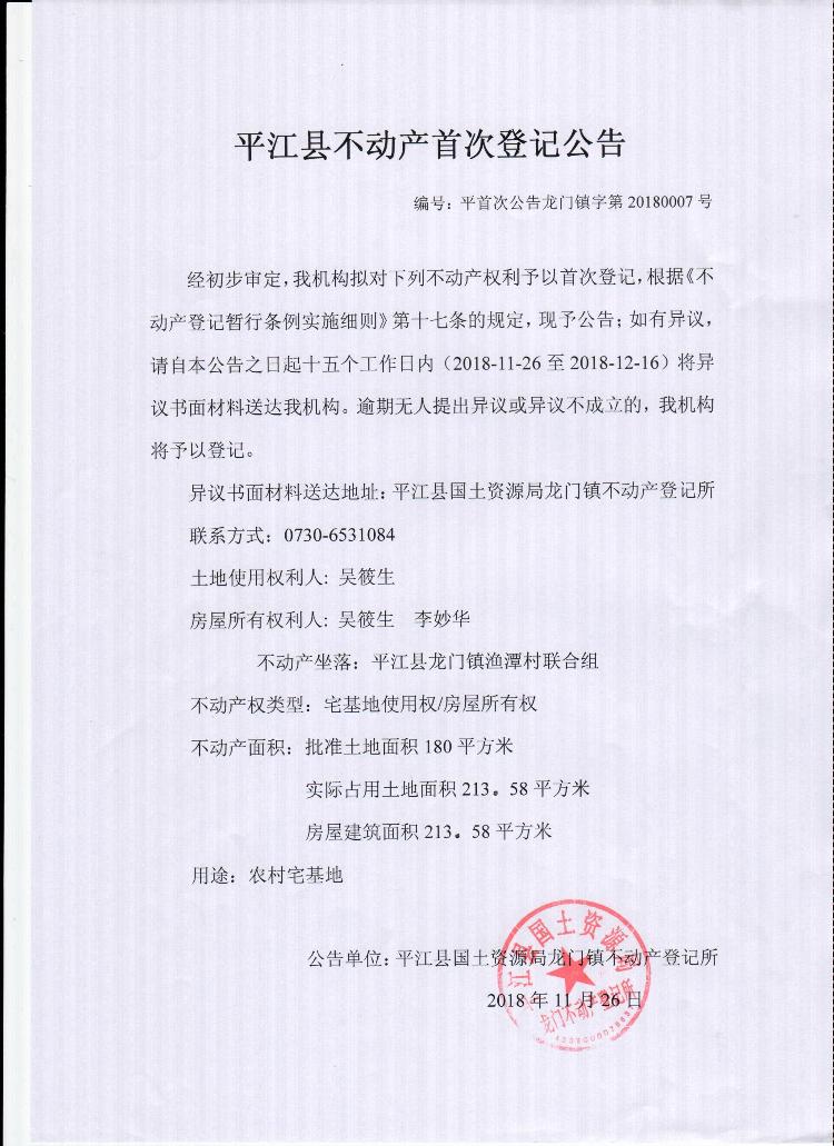 吴筱生 李妙华不动产首次登记公告 龙门字第20180007号