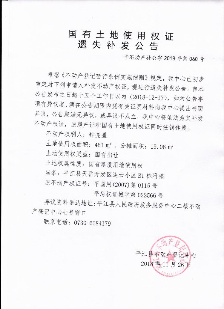 钟亮星国有土地使用权证遗失补发公告平不动产补公字2018年060号