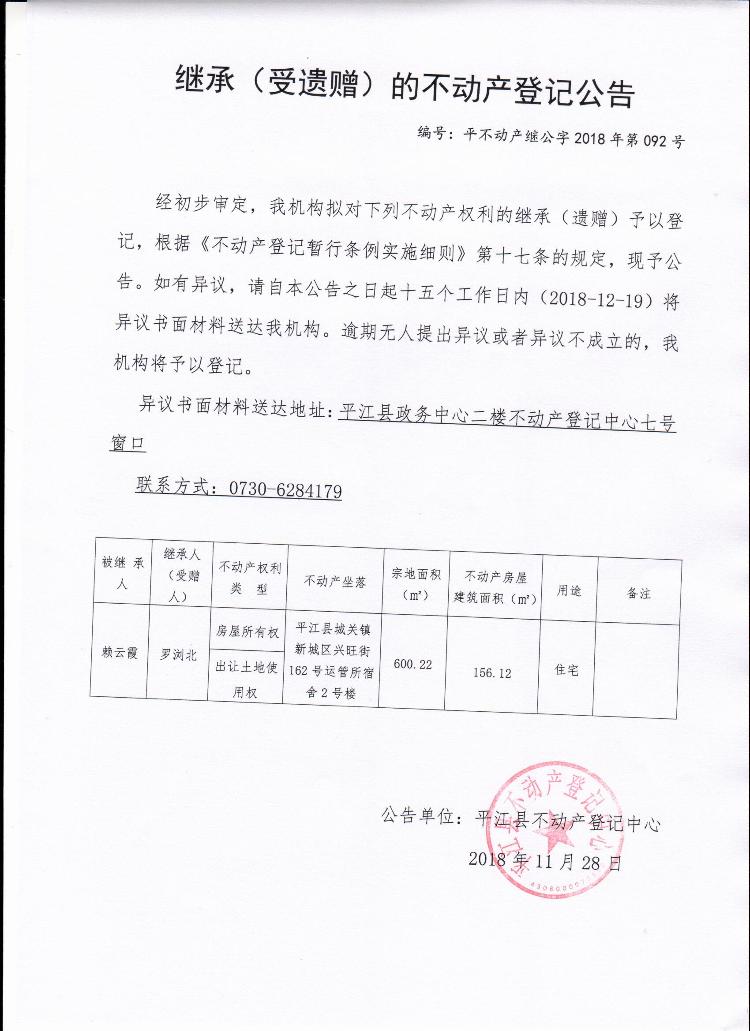 罗浏北继承(受遗赠)的不动产登记公告平不动产继公字2018年第092号