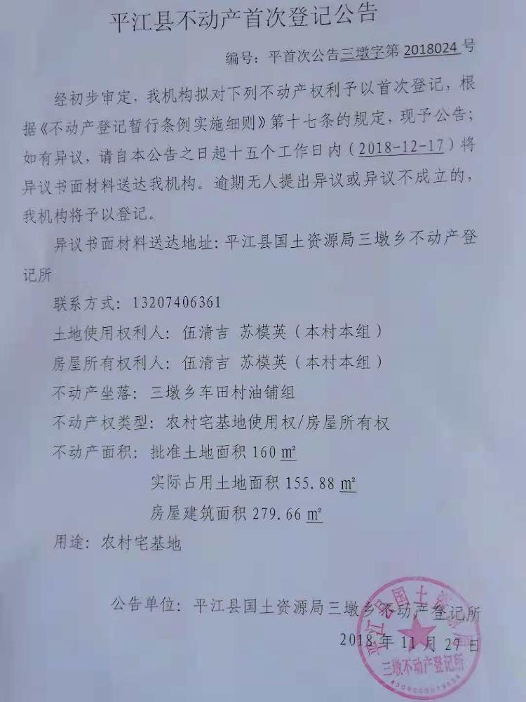 伍清吉 苏模英不动产首次登记公告 三墩字第2018024号