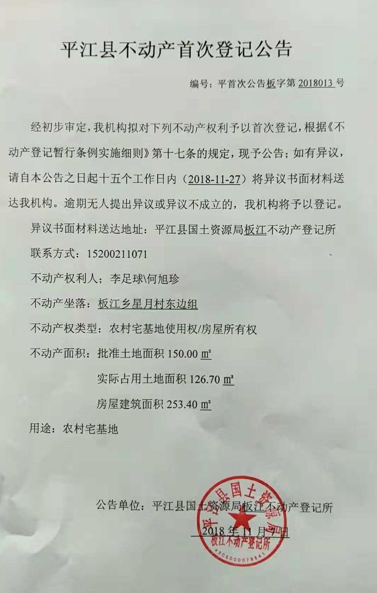 李足球 何旭珍不动产首次登记公告 板字第2018013号