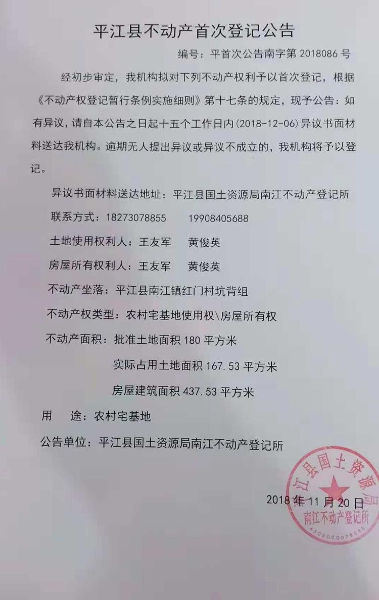 王友军 黄俊英不动产首次登记公告 南字第2018086号