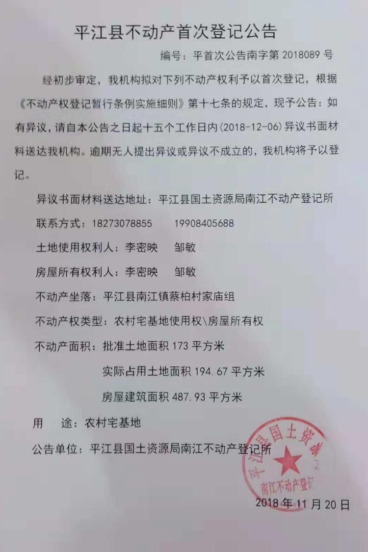 李密映 邹敏不动产首次登记公告 南字第2018089号