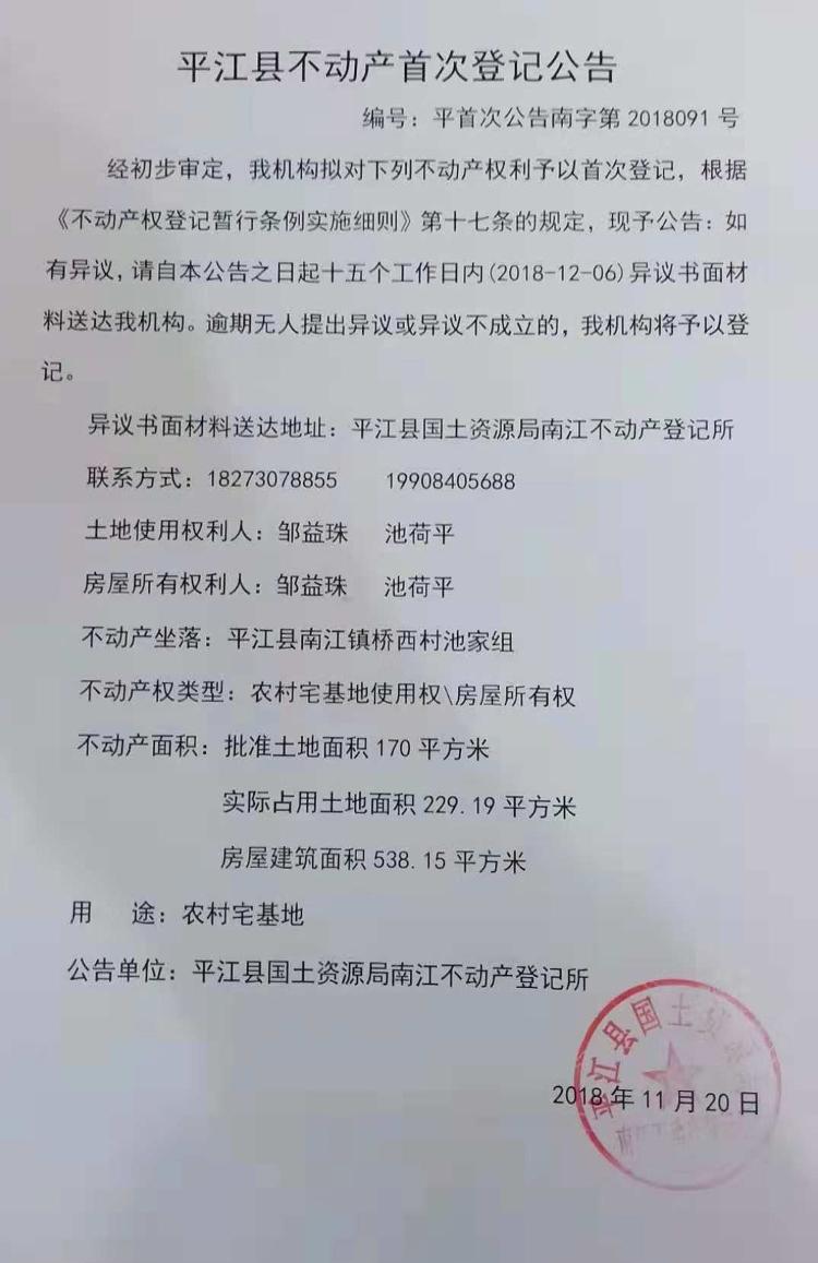 邹益珠 池荷平不动产首次登记公告 南字第2018091号