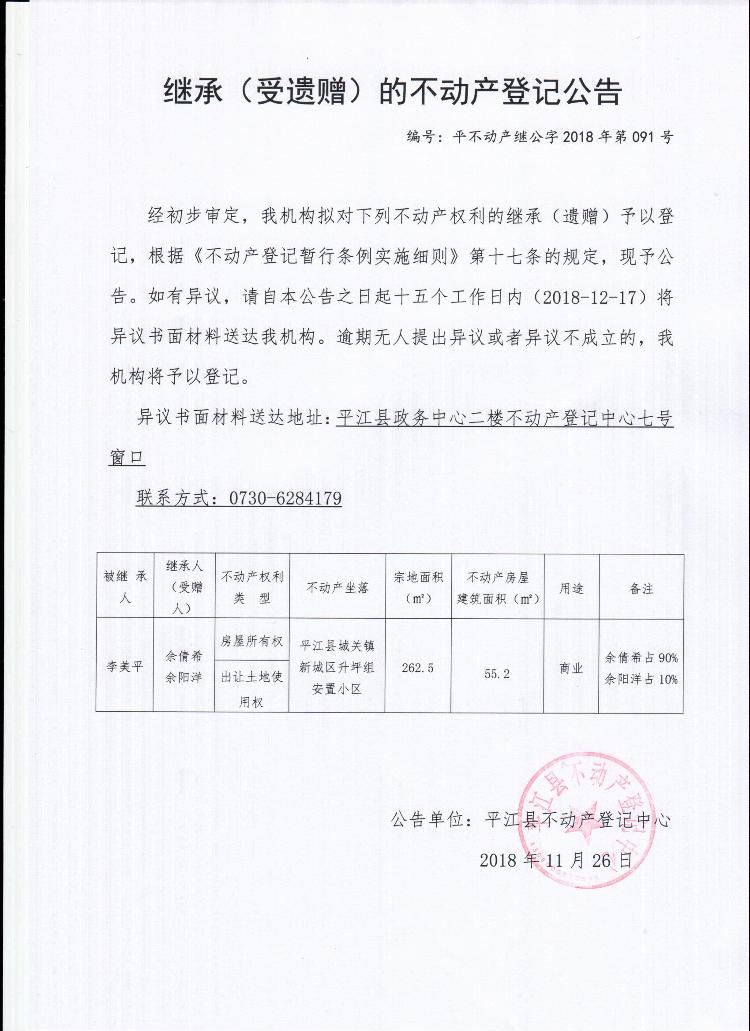 余倩希 余阳洋继承(受遗赠)的不动产登记公告平不动产继公字2018年第091号