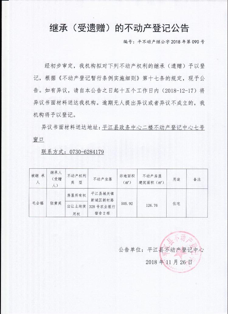 张黄英继承(受遗赠)的不动产登记公告平不动产继公字2018年第090号