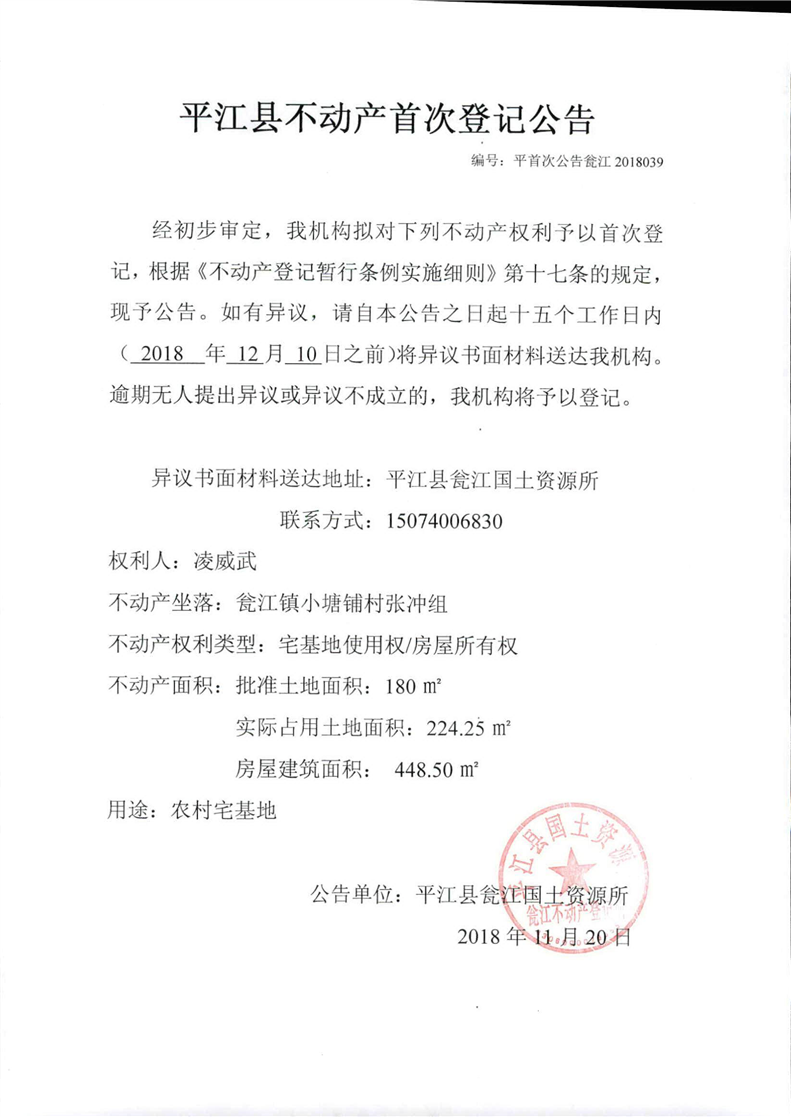 凌威武不动产首次登记公告 瓮江2018039