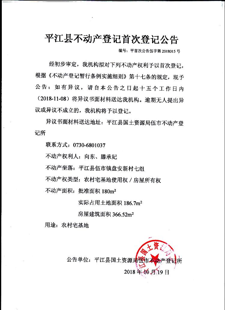 向东 滕承妃 平江县不动产登记首次公告 伍字第2018015号