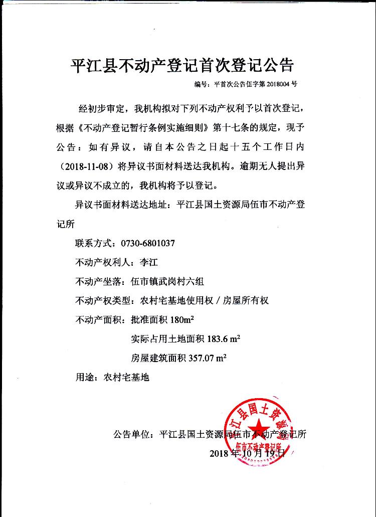 李江 平江县不动产登记首次公告 伍字第2018004号