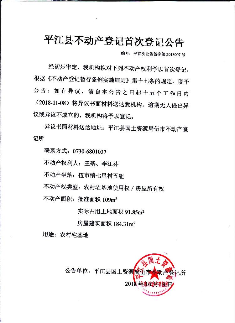 王基 李江芬 平江县不动产登记首次公告 伍字第2018007号