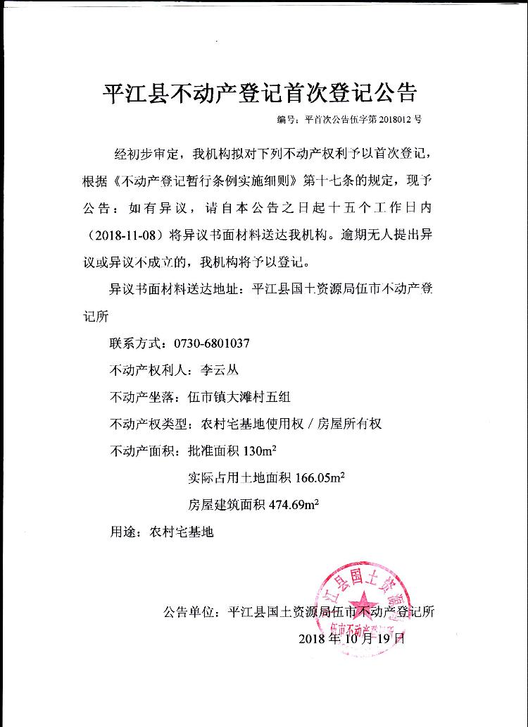 李云丛平江县不动产登记首次公告 伍字第2018012