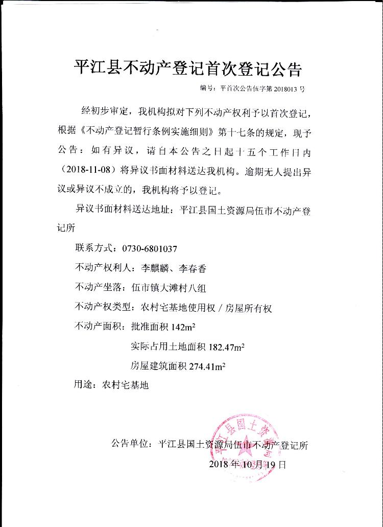李麒麟 李春香平江县不动产登记首次公告 伍字第2018013号
