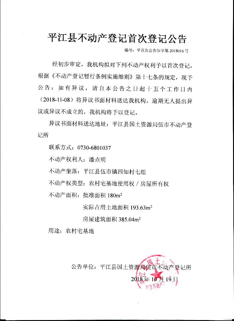 潘点明平江县不动产登记首次公告 伍字第2018016号