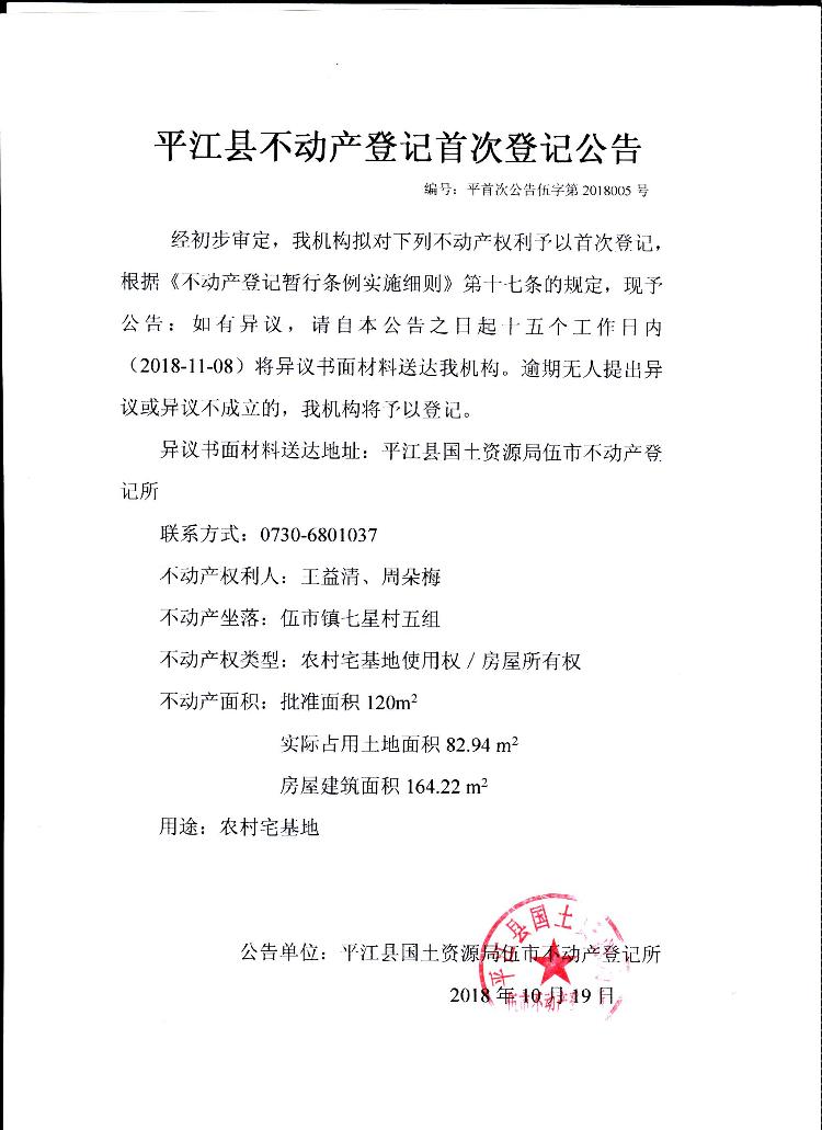 王益清 周朵梅平江县不动产登记首次公告 伍字第2018005号