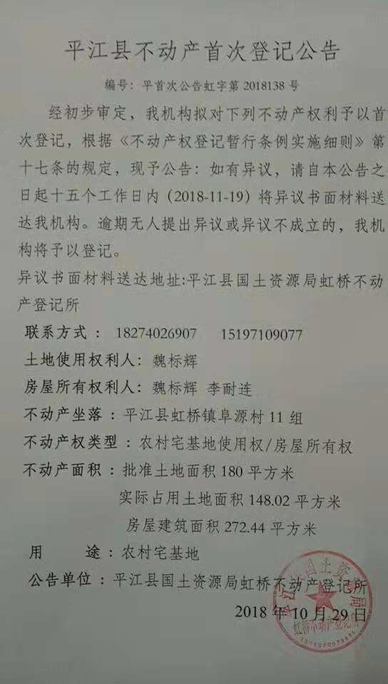 魏标辉 李耐连不动产首次登记公告 虹字第2018138号