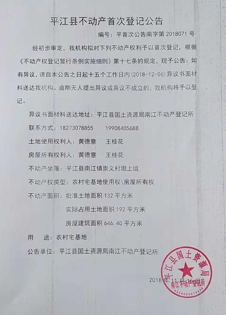 黄德意 王桂花不动产首次登记公告 南字第2018071号
