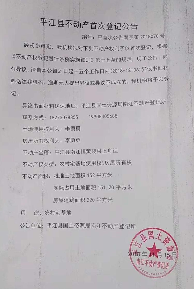 李勇勇不动产首次登记公告 南字第2018070号