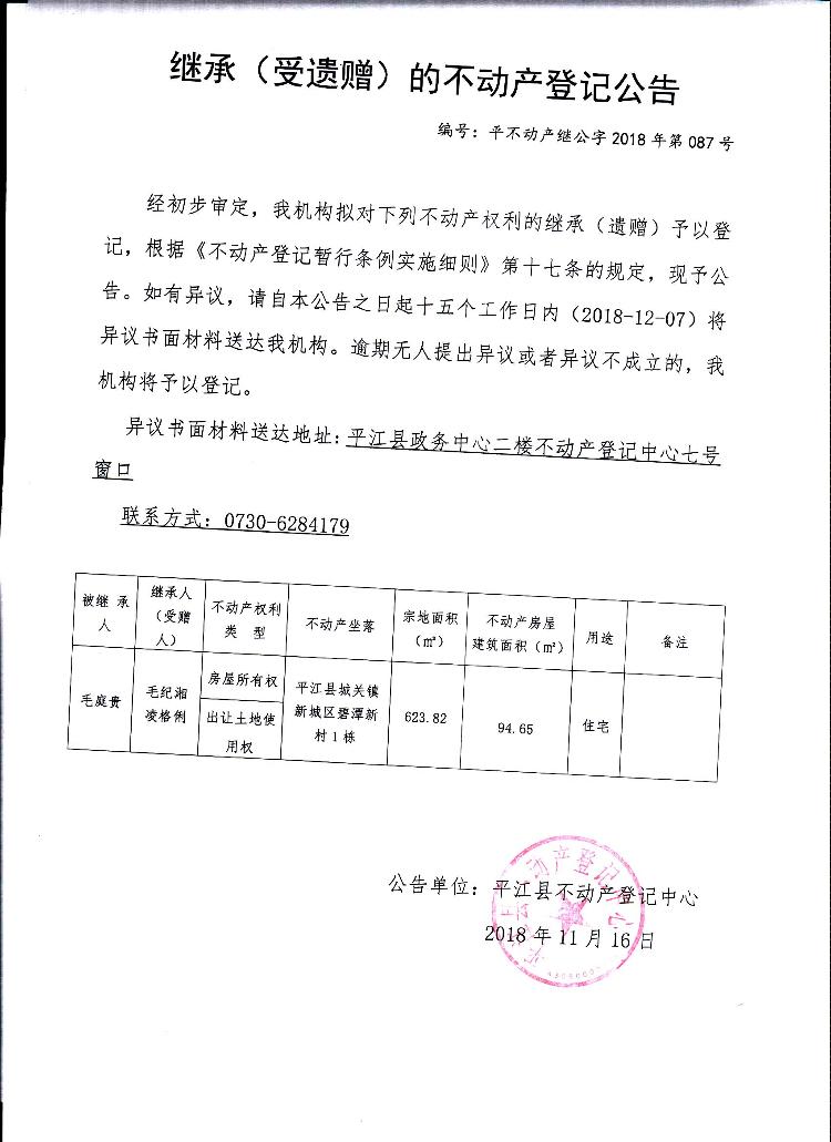 毛纪湘 凌格俐继承(受遗赠)的不动产登记公告平不动产继公字2018年第087号