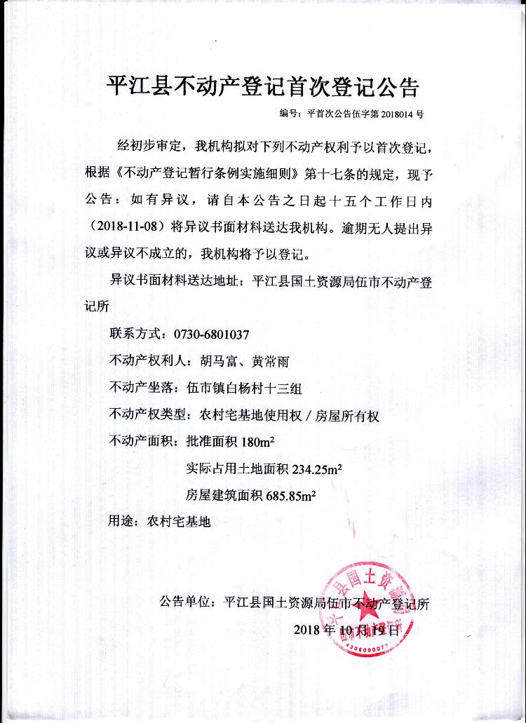 胡马富 黄常雨平江县不动产登记首次公告 伍字第2018014号