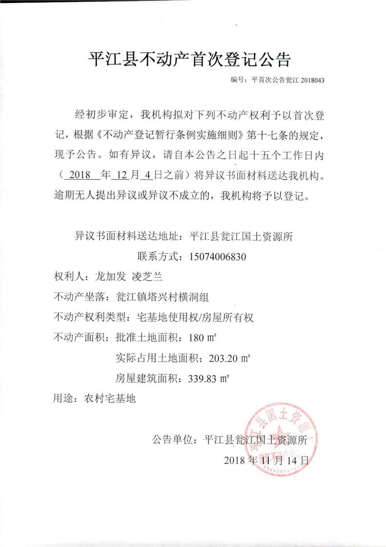 龙加发 凌芝兰不动产首次登记公告 瓮江2018043
